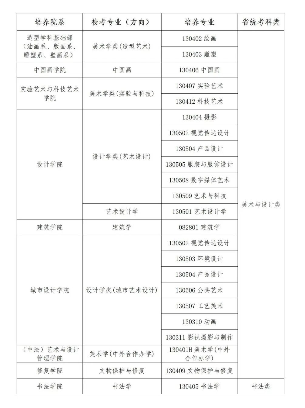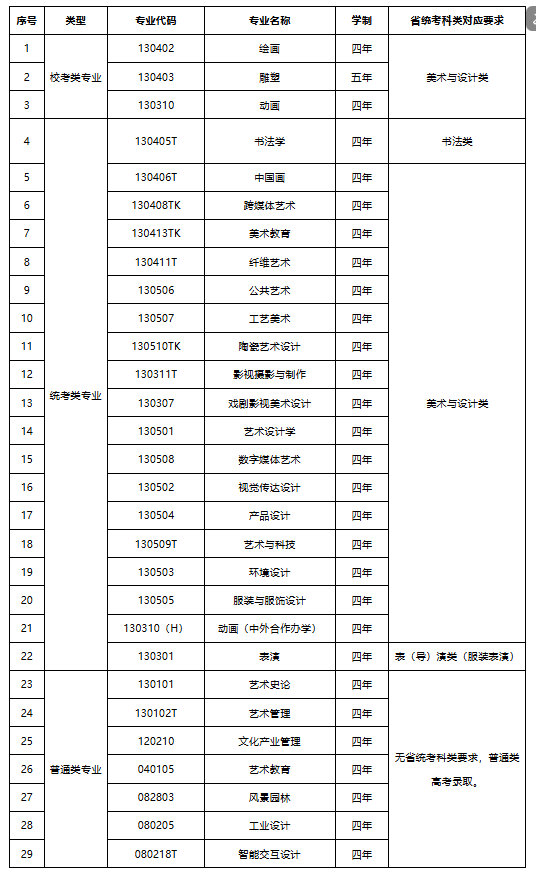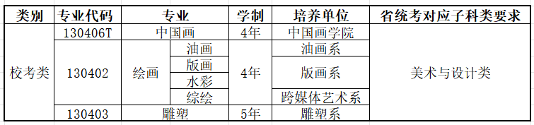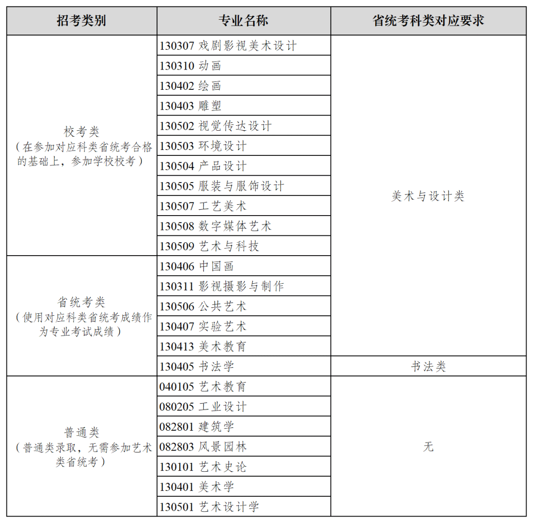 艺考资讯丨2026届美术校考院校(联考&校考)本科招生专业汇总发表时间:2025-10-09 16:58 ![]() 截至目前,已有包括国美、央美、川美、天美、湖美、鲁美、西美、景陶、北印、中传、央民、中戏、北电、上美、上戏、浙传在内的16所高校公布了2026年美术类校考专业安排。 其中,中国美术学院、西安美术学院、景德镇陶瓷大学、北京印刷学院、中央民族大学、中央戏剧学院、北京电影学院、上海大学、上海戏剧学院、浙江传媒学院等10所院校的校考安排与往年保持一致,未作调整。 而以下几所院校在校考政策上则有所变化: 一、中央美术学院: 2026年不再组织美术学专业的校考,其他无变化。 二、四川美术学院: 1.中国画、影视摄影与制作、公共艺术、实验艺术、美术教育、书法学6个专业调整为使用省统考成绩,不再组织校考。 2.其他校考专业如绘画、雕塑、动画、视觉传达设计等均需在浙江省美术与设计类统考合格基础上参加校考,与去年相比较无变化。 三、天津美术学院: 2026年仅保留中国画、绘画、雕塑、实验艺术4个专业组织校考,取消了2025年组织校考的文物保护与修复、跨媒体艺术、科技艺术、摄影、动画、戏剧影视美术设计、视觉传达设计、数字媒体艺术、工艺美术、服装与服饰设计、产品设计、环境设计、公共艺术共13个专业。 四、湖北美术学院: 2026年起,中国画、书法学术两个专业取消校考,转为统考招生!且新增“智能交互设计”,按照普通类录取。 五、鲁迅美术学院: 校考专业再次缩减,2026年起中国画、动画、书法学、服装与服饰设计、数字媒体艺术(中外合作办学)取消校考! 六、中国传媒大学: 1.2026年新增专业:增设游戏艺术设计专业,该专业使用省统考成绩招生,不组织校考。 2.2026年取消校考专业:摄影、视觉传达设计、动画(游戏艺术方向)、漫画、新媒体艺术等专业不再组织校考,改为使用省统考成绩录取。 3.2026年美术类校考专业(如影视摄影与制作、环境设计等)仍对应浙江省美术与设计类统考,但部分专业校考取消后,考生直接通过统考成绩报考。 4.校考资格要求:2026年明确要求考生取得省级统考子科类合格成绩后,才有资格取得校考合格证。若同一专业对应多个统考子科类,考生需至少通过其中一个。 5.录取要求:录取时,考生统考成绩需达到生源省份相应类别的本科合格线。 七、北京服装学院: 新增“珠宝首饰设计与工艺”(2026首年招生,承认统考);“绘画(学校美育)”纳入绘画专业统一招生(承认统考)。 具体有关2026届美术校考院校(联考&校考)本科招生专业的文件汇总如下: 中国美术学院 ![]() 与往年保持一致,未作调整。 文件如下: 为贯彻落实《教育部关于进一步加强和改进普通高等学校艺术类专业考试招生工作的指导意见》(教学〔2021〕3号)精神,根据教育部特殊类型招生工作要求,现将我校招生专业(类)与省统考科类对应要求予以公布。 ![]() 注: 1.中国画传统笔墨技法和素描速写技法的考生均需参加各省美术与设计类统考。 2.普通类招生专业无省统考科类要求。 中国美术学院招生咨询联系方式: 学校招生网址:http://zb.caa.edu.cn 招生办公室联系电话:0571—87164630,0571--87200900 中央美术学院 ![]() 2026年不再组织美术学专业的校考,其他无变化。 文件如下: ![]() 四川美术学院 ![]() 1.中国画、影视摄影与制作、公共艺术、实验艺术、美术教育、书法学6个专业调整为使用省统考成绩,不再组织校考。 2.其他校考专业如绘画、雕塑、动画、视觉传达设计等均需在浙江省美术与设计类统考合格基础上参加校考,与去年相比较无变化。 文件如下: 各位考生:2026年学校本科招生专业、招考类别及省统考科类对应要求公告如下,报考我校相应艺术类专业须按以下省级统考科类对应要求参加相应科类省级统考。 ![]() 四川美术学院招生处官网:https://www.scfai.edu.cn/zsb 四川美术学院招生处官方微信公众号:川美招生 联系电话:023-65921056(工作日:09:00-12:00,14:30-17:30) 邮箱:zs@scfai.edu.cn 天津美术学院 ![]() 2026年仅保留中国画、绘画、雕塑、实验艺术4个专业组织校考,取消了2025年组织校考的文物保护与修复、跨媒体艺术、科技艺术、摄影、动画、戏剧影视美术设计、视觉传达设计、数字媒体艺术、工艺美术、服装与服饰设计、产品设计、环境设计、公共艺术共13个专业。 文件如下: 按照教育部特殊类型招生工作要求,现将我校2026年本科招生校考专业对应的省统考科类公告如下: ![]() 湖北美术学院 ![]() 2026年起,中国画、书法学术两个专业取消校考,转为统考招生!且新增“智能交互设计”,按照普通类录取。 文件如下: ![]() 鲁迅美术学院 ![]() 校考专业再次缩减,2026年起中国画、动画、书法学、服装与服饰设计、数字媒体艺术(中外合作办学)取消校考! 按教育部相关要求,报考我校艺术类专业的考生须按我校各专业与省级统考科类对应要求参加相应省级统考,我校2026年各专业招考类别和省级统考科类对应要求如下: ![]() 西安美术学院 ![]() 与往年保持一致,未作调整。 文件如下: 按教育部艺术类专业招生工作要求,报考我校2026年校考类专业的考生须按我校校考类专业与省级统考科类对应要求参加相应省级统考,具体要求如下: ![]() 我校最新的招考信息将在招生信息网发布,请考生及时关注。 景德镇陶瓷大学 ![]() 与往年保持一致,未作调整。 文件如